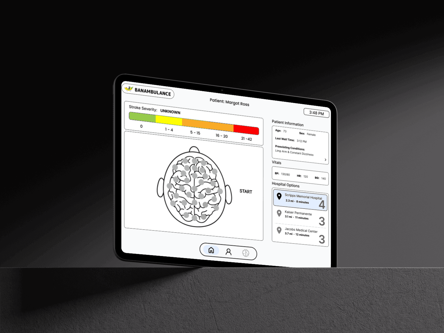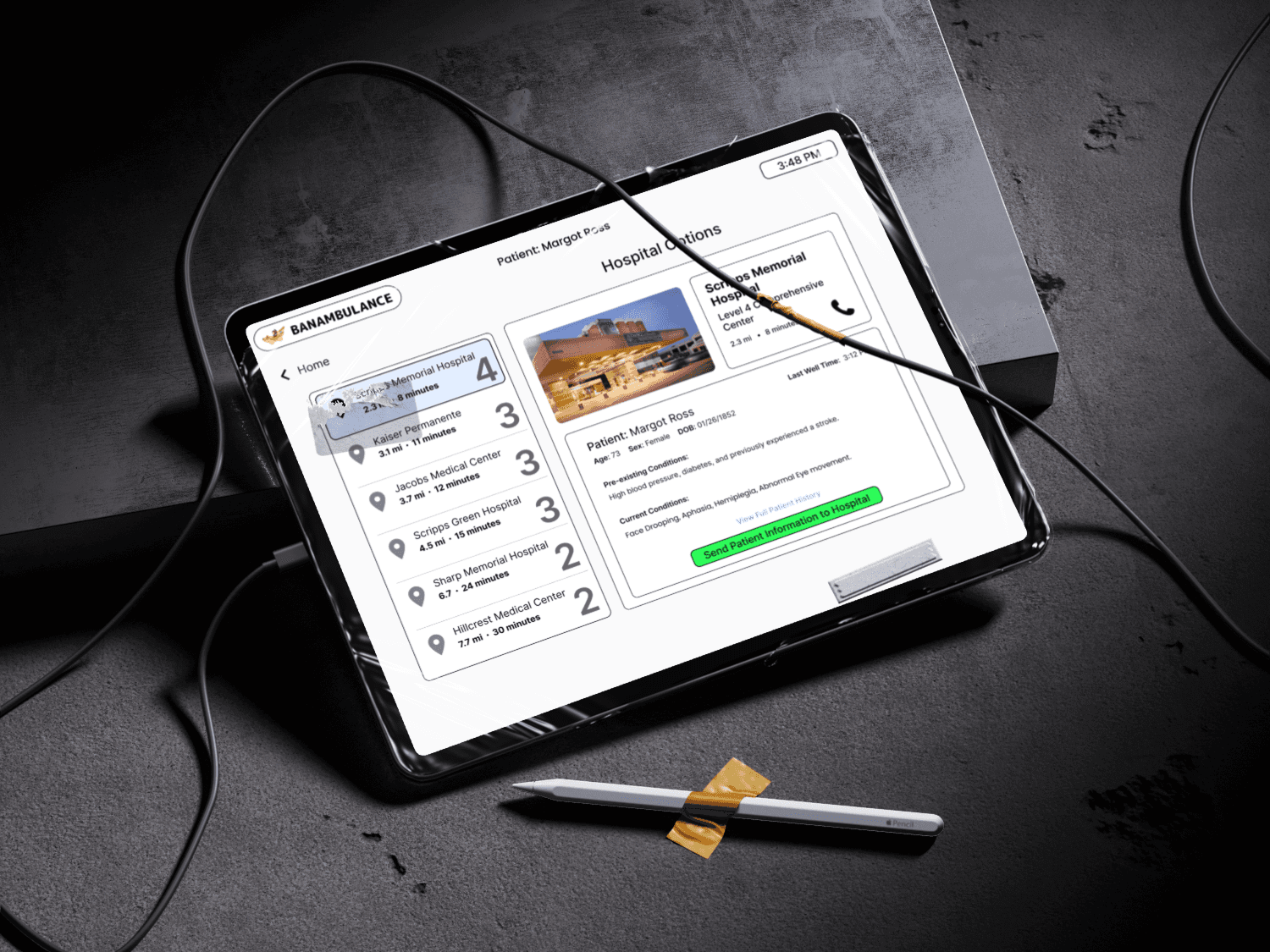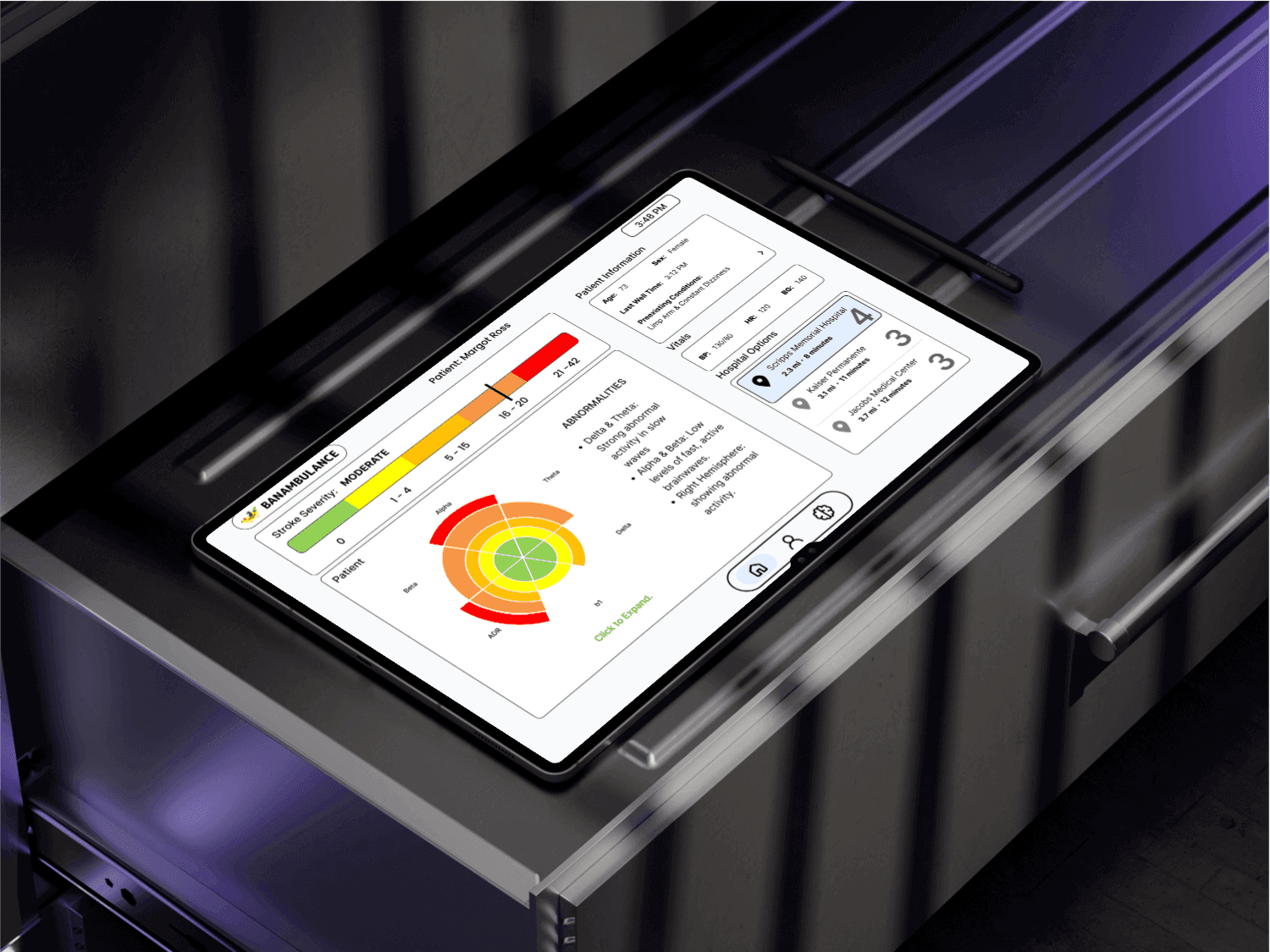 Our team worked alongside UC San Diego's Cognovate Labs, a Med-Tech startup & research lab. Our goal was to solve the problem of time lost between stroke onset and receiving treatment. Creating a solution that was intuitive and clear for an EMT to understand in a fast-paced environment was critical for this process. As we work to implement Banambulance into their system, this becomes more possible than ever.