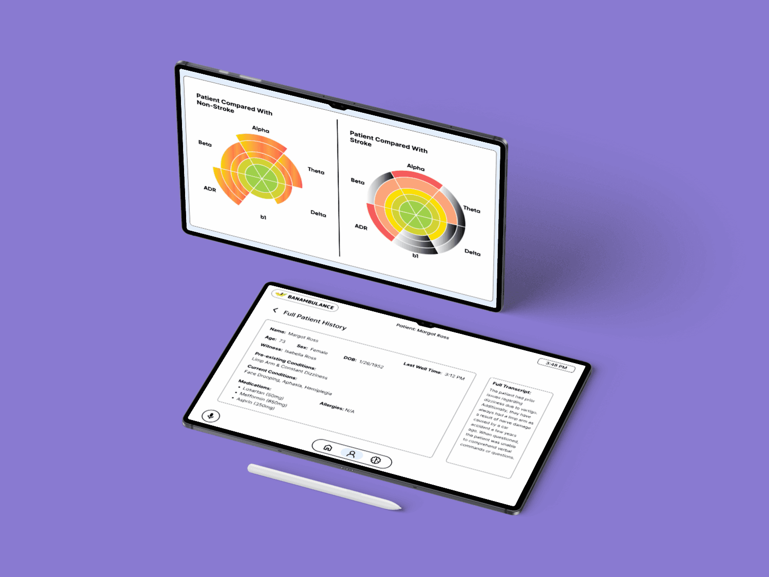 Banambulance is a groundbreaking medical application designed specifically for Emergency Medical Services (EMS), addressing the aforementioned challenges head-on. It offers a range of features, including an EEG cap providing clear & real-time brain data, microphone-input patient history, and an incorporation of BEFAST (a current EMS stroke protocol). We bring in critical information that equips EMS to more accurately identify strokes on the spot. With 87% of strokes being ischemic and treatable if caught early, our application helps save time, save lives, and give patients a better chance at recovery.